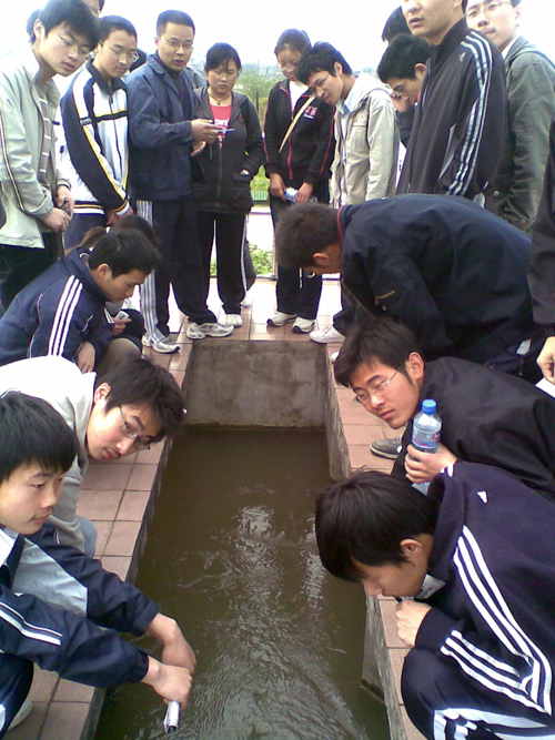 2008年4月23日上午30余名同学从田楼出发,直达目的地——杨家门自来水厂。在历时两个多小时的参观过程中,同学们不仅真切感受和了解了污水的净化与再利用过程,从中更深入地认识到我国目前严峻的水危机。参观期间,同学们还向自来水厂的讲解人员工艺工程师李彬了解了机器工作的原理和流程,部分同学还获得了亲自实践的机会。