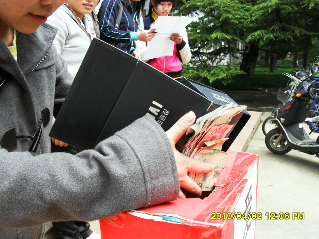 4月2日中午12:00,在学院团委的组织下,学院各团支部书记带着支部同学们的爱心纷纷来到生化楼门前进行爱心捐助。院团委副书记朱琳和07级辅导员苏桂琴代表院学生工作组也前来捐献爱心。在短短半个小时不到的时间里,网上买彩票