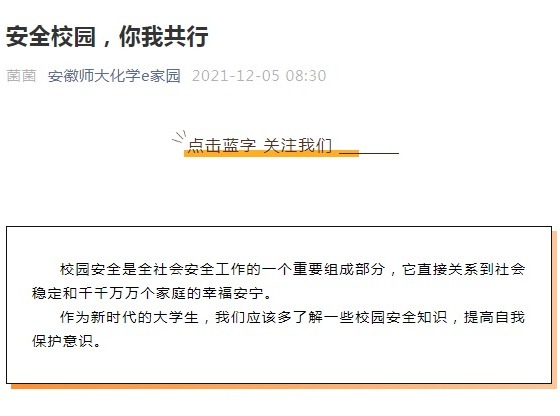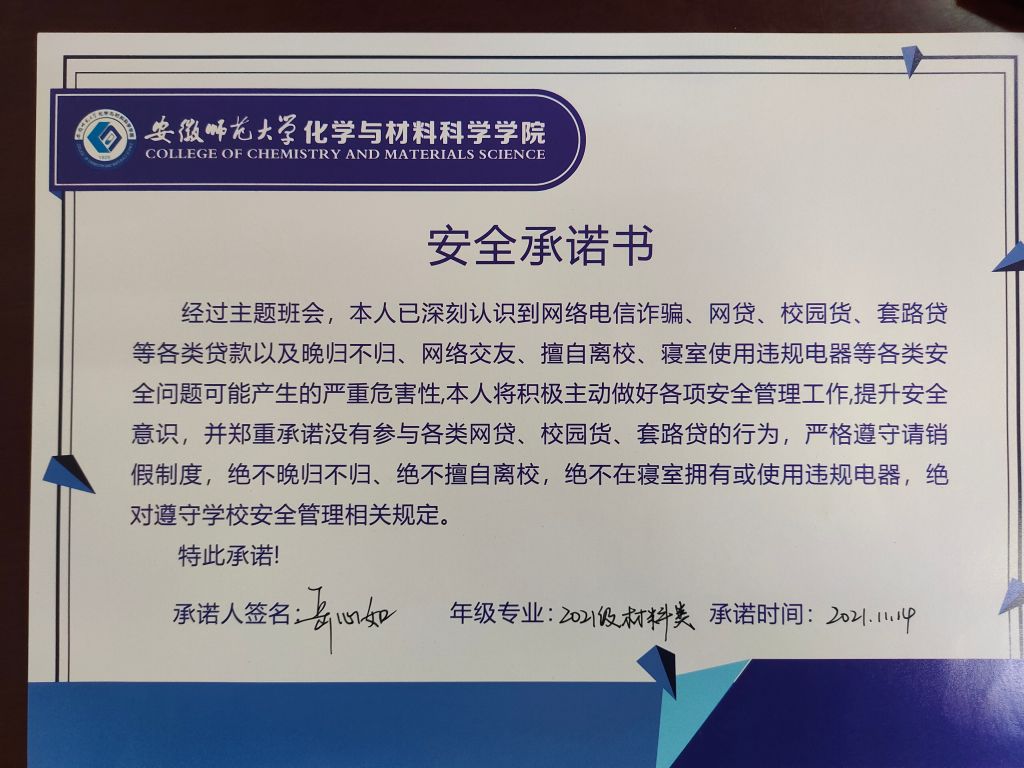 12月2日,学院召开会议,对2018级学生进行研究生考试及就业安全教育提醒。各年级专业召开冬季安全教育主题班会,引导学生深入学习学生宿舍的用电规范,并列举了违规使用大功率电器、违规用电等行为易造成的校园危险隐患。学院组织学生签署《安全承诺书》,通过微信公众号推出“安全校园,你我共行”专题,教育同学注意用电安全、交通安全、卫生安全等。部分班级还召开线上线下结合的寝室长会议,学院、班级、寝室三级联动,有效提升学生的安全意识,筑牢校园安全防线。