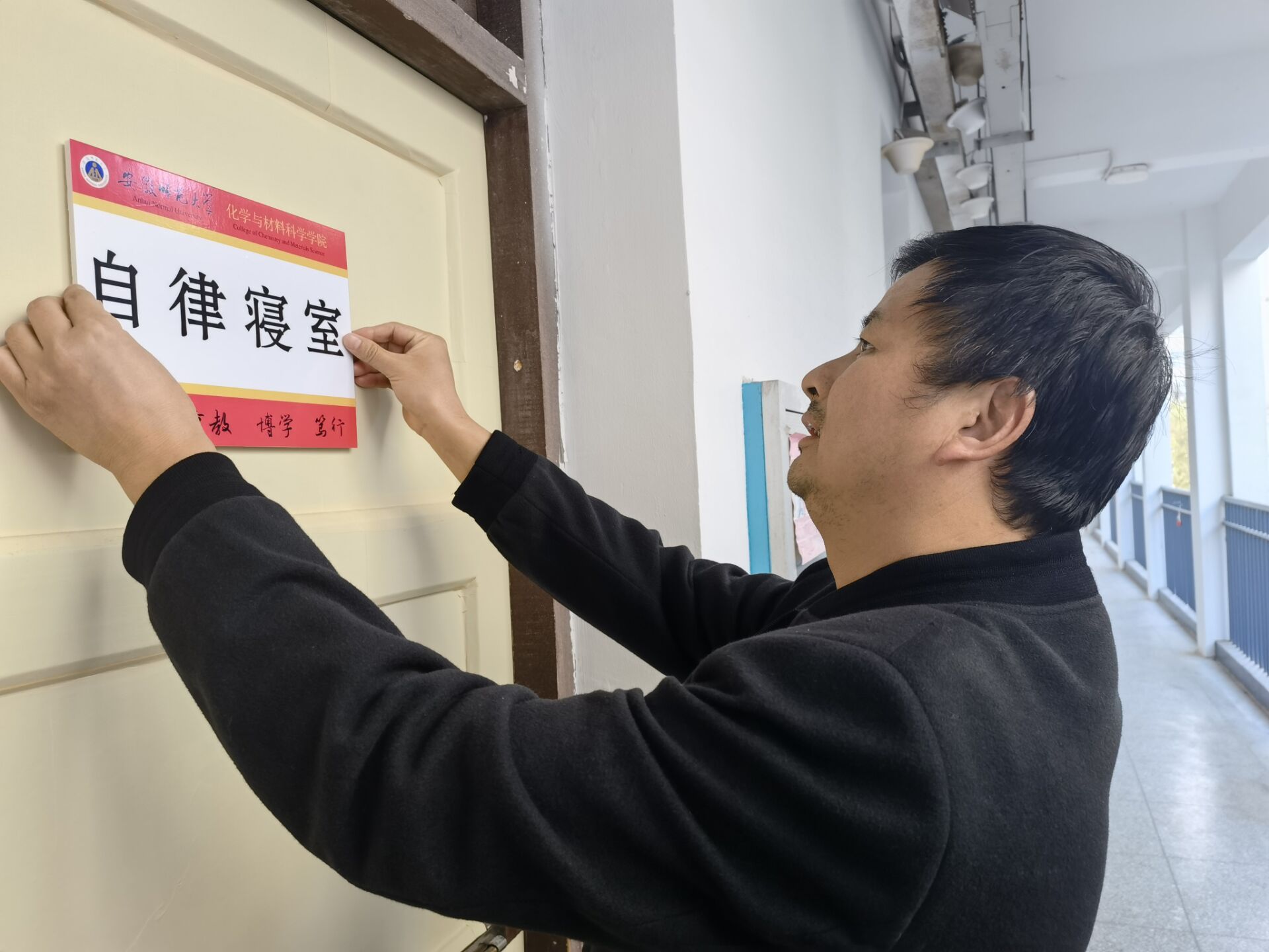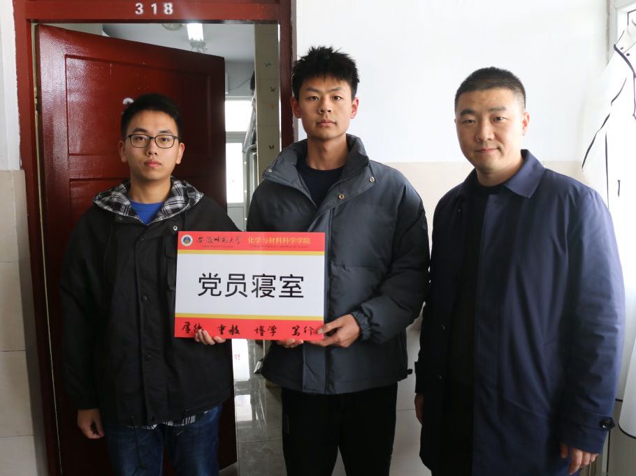 在进行宿舍卫生安全检查的同时,学院领导老师为本年度党员寝室、自律寝室挂牌,学院党委书记汪俊武指出,学生党员和自律寝室成员要在和谐宿舍创建工作中充分发挥先锋模范作用,以实际行动影响和带动其他学生养成良好的行为规范,努力营造温馨舒适的学习生活氛围,以室风带动学风,彰显化材学子的青春风采。