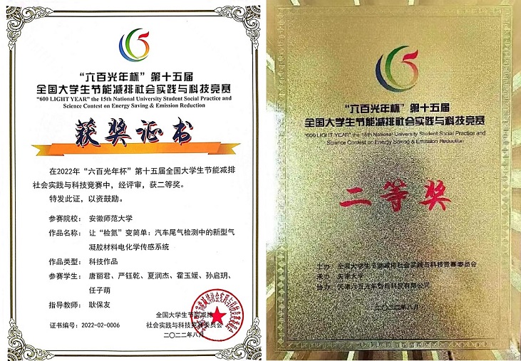 唐丽君、严钰乾、夏润杰、霍玉媛、孙启玥、任子萌等同学的项目《让‘检氮’变简单:汽车尾气检测中的新型气凝胶材料电化学传感系统》,获得全国二等奖。